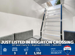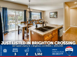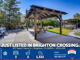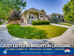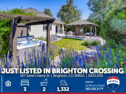 107 Sand Cherry St | Brighton CO 80601 | Brighton Crossing Main floor living at it's finest in Brighton Crossings with a backyard sanctuary that will take your breath away! Whether you're working from home, retreating from work or retired, this 3-bedroom ranch home will please the pickiest of buyers. Meticulously cared for and move-in ready. Nestled on a large corner lot surrounded by mature landscaping including 40-trees which provide the peace and tranquility not often found in the 'burbs. Entertain family & friends under the massive custom-built pergola or gather around the gas firepit and enjoy the gorgeous perennials that quickly transform you into what feels like a mountain retreat. There's even an underground wine cellar that you simply will not find anywhere at any price. Once the sun goes down, soak in the large jetted spa and appreciate all your blessings. Love gardening? You'll appreciate the greenhouse with drip system + custom-built garden sheds so you can care for your plants year-round. Inside you'll find new carpeting, new custom window blinds, fresh paint, tile & hardwood flooring, large master suite with 5pc bath + walk-in closet. Brighton Crossings is the perfect community to gain the luxury of time saved and time enjoyed. Surrounded by 9 Parks and trails, you’ll find playgrounds, open grass lawns, splash pads and more with miles of interconnected walkways. Nearby is the King Soopers Marketplace, with pizza, hair and nail salons, bank and other retailers for your one-stop-shop. The 3,200 sqft Crossings Fitness Center for residents only, is stocked with new exercise equipment, flex space, amazing western views, and a kids area. 2.5-acre Crossings Dog Park for your furry family members, big and small, to come play with their neighbors. Brand New Venture Center Water Park with even bigger pools and larger facility. Brighton Crossings lives within the Brighton 27J school district, which includes elementary, middle and high schools minutes from your new home. Charter and other school types are also nearby. Available for a Quick Closing & Possession after July 3rd! Listed by Anthony Rael. For more info, 'Just Call Ants' at 303/520-3179.