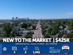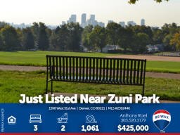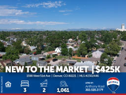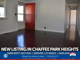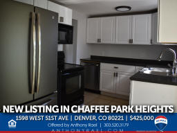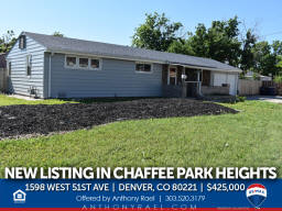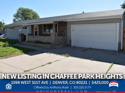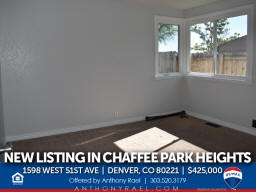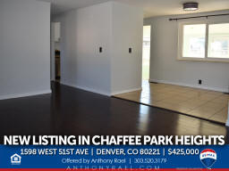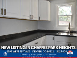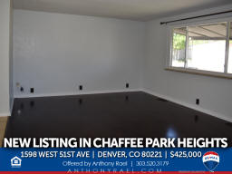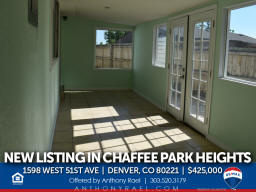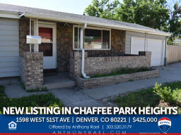 1598 West 51st Ave | Denver CO 80221 in Chaffee Park Nestled between Chaffee Park and Zuni Park, this recently renovated ranch home is move-in ready with immediate possession. Featuring 3 bedrooms + 1.5 baths with 1,150 sqft that includes a spacious tiled sunroom that perfect for a yoga studio or indoor plants, 6' privacy fencing in backyard with large patio space to BBQ or entertaining family and friends + mature tree and space for your garden. Oversized one-car garage with plenty of extra storage space + three dedicated parking spaces on concrete pad + ample on-street parking along 51st. New improvements include: roof; gutters; siding; garage door; energy-efficient windows; tankless hot water heater; stainless steel refrigerator; dishwasher + newer energy-efficient central furnace and central air conditioning. Hardwood flooring extends from the entry and down the hallway to the carpeted bedrooms. Stackable washer/dryer are also included. This ranch style home was recently painted and professionally cleaned (including the carpets). The Chaffee Park neighborhood is conveniently located less than 5 minutes to Sunnyside, LoHi and Highlands and 10 minutes to Union Station, Pepsi Center, Coors Field or RiNo. RTD bus stop is across the street + light rail stops within a few minutes drive or bike ride. Be sure to swing by Zuni Street Park for incredible views of the Downtown Denver skyline. What are you waiting for? Move-in ready homes in this price range are few and far between in this market. Available for a Quick Closing & Immediate Possession. Listed by Anthony Rael. For more info, 'Just Call Ants' at 303/520-3179.