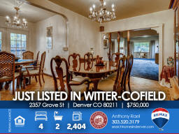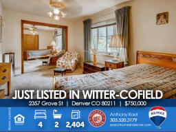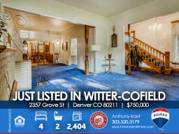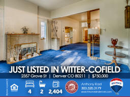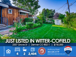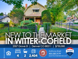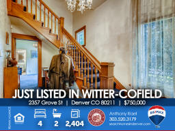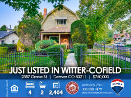 2357 Grove St Denver CO 80211 Remarkable Queen Anne Victorian two-story gem in the heart of Denver's Witter-Cofield Historic District. This 1902 red brick home is located on a gorgeous wrought iron fenced corner lot and has been occupied by the same family for 80+ years - making this a once-in-a-lifetime home buying opportunity! There have been a few additions over the years to expand the main floor living spaces and kitchen. Step outside the covered patio and enjoy the lovely perennial gardens and meticulously manicured landscaping. The furnace is brand new + newer roof + updated electrical & plumbing. The bones are solid on this hidden gem and just needs the right buyer who sees the potential to restore this beauty to its former glory. Incredible location - less than 10 minutes to Downtown Denver, Sloans Lake, Highlands Square, Tennyson Street, Union Station, Pepsi Center (Ball); Coors Field, Larimer Square, Buell Theater / DPCA and so much more. This rare find is likely to generate a lot of interest, so be sure to schedule a showing sooner than later. Listed by Anthony Rael. For more info, 'Just Call Ants' at 303/520-3179.