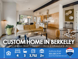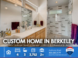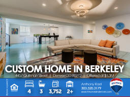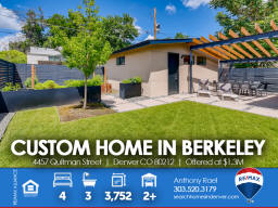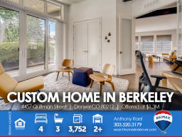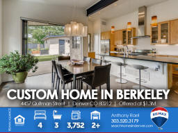 4457 Quitman St | Denver CO 80212 | Berkeley Welcome to this spectacular custom-built home in the heart of Berkeley - one of Denver's most cherished, and fastest-changing, neighborhoods. Original property was scraped in 2014 to make way for this Frank Lloyd Wright design-inspired and meticulously crafted sprawling ranch home which is sure to satisfy the pickiest homebuyer seeking to take residence in a premium location within 15-minutes of downtown Denver. Solid light cherry hardwood floors cascade from the front entry throughout the entire main living areas. The gourmet kitchen boasts Paykel and Fisher stainless steel appliances including a gas-fueled range & double oven. The massive island doubles as meal prep space as well as casual bar stool seating area. The dining area can accommodate large dinner parties and seamlessly transitions outdoors through the imported Australian trifold glass doors that open up to an extended covered patio. Additionally, there's ample space under the pergola for entertaining and outdoor dining. The spacious primary suite includes a spa-like bath bedrooms + three additional generous sized bedrooms and two additional baths. This home is perfectly designed to allow maximum natural light while preserving privacy with each window fitted with Hunter Douglas Silhouette window coverings throughout. From the style and sophistication to the abundant open concept that provides all the living and storage space you'll ever want or need. This custom gem is perfectly nestled between Berkeley & Rocky Mountain parks, fringed by walking trails, dog park and flanked by Tennyson Street with its boutiques, abundant eateries and laid-back taprooms + Oriental Theater, an old-school venue for movies and live music. Simply put, you will not find another home that compares anywhere in the Denver marketplace! Listed by Anthony Rael. For more info, 'Just Call Ants' at 303/520-3179.