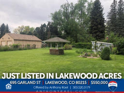 695 Garland St Lakewood CO 80215 in Lakewood Acres Estate Sale in Lakewood Acres! Charming ranch home on 1/2-acre lot only 15-minutes to downtown Denver or the foothills in Genesee. Move-in Ready, just peel back the carpeting and expose the beautiful solid hardwood floors on the main floor for an instant & dramatic change. Featuring two bedrooms with ample-sized closets and plantation shutters and completely updated 3/4 bath (2018) on the main level + open kitchen/dining area that flows nicely onto the newer large TREX deck overlooking the massive backyard :: perfect for entertaining family or friends of any size. One-owner since 1958, but well maintained with all of the primary items replaced in the last few years including: double pane Accent Windows & Sliding door (2013); New Roof (2017); Updated Electrical Panel; Exterior Paint (2017 and still under warranty). Wood burning fireplace in living room and electric fireplace cutout in basement. Massive oversized 2+ car garage (705 sqft) with plenty of RV space on South side of lot + outbuilding/shed + chicken coop and water feature. Basement is finished with a third bedroom (non-confirming), just replace the low-shag carpeting and apply a fresh coat of paint but leave the beautiful stained pine paneling and you're good-to-go. The laundry room is large and provides plenty of extra interior storage space. Enjoy the privacy and peaceful setting of this great home and lot. Hop on the RTD Light Rail Line (13th & Garrison Station) for quick trip downtown, Mile High Stadium, Pepsi Center or Union Station! This rare find is updated & a fixer-upper at the same time and is **Available for a Quick Closing & Immediate Possession**. Listed & Marketed Exclusively by Anthony Rael. For more info, 'Just Call Ants' at 303/520-3179.